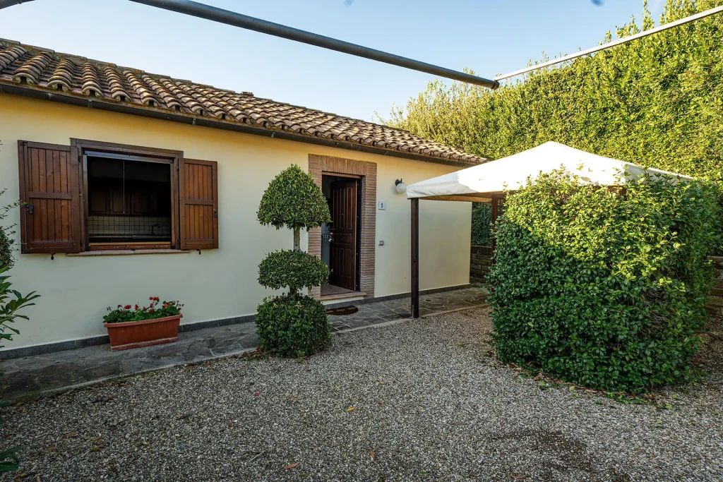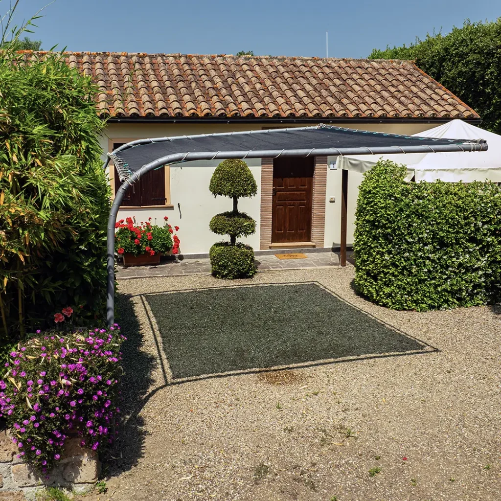 Outside, a charming gazebo furnished with a table, chairs, and deckchairs provides an ideal space to relax outdoors. Guests can also enjoy a dedicated pool area with sun loungers and private parking, ensuring maximum convenience during their stay.